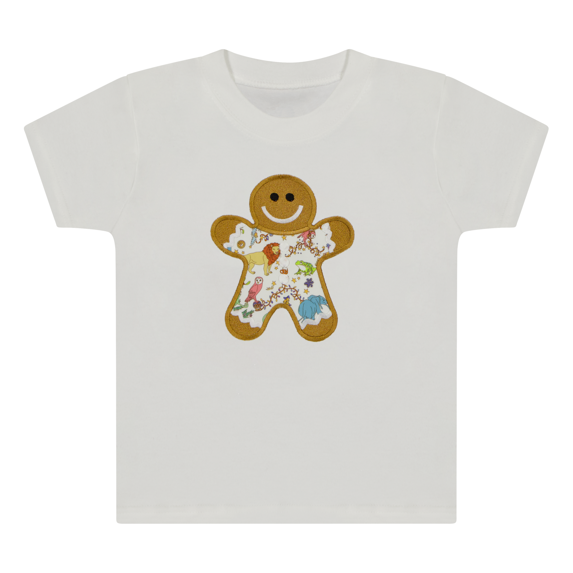 Super soft brushed cotton tee with a cheerful gingerbread boy appliqué. Featuring Liberty London Animal Christmas fabric, stitched in Driftwood gingerbread thread with Frosted Pearl white accents. Simple, sweet, and perfect for everyday wear.
