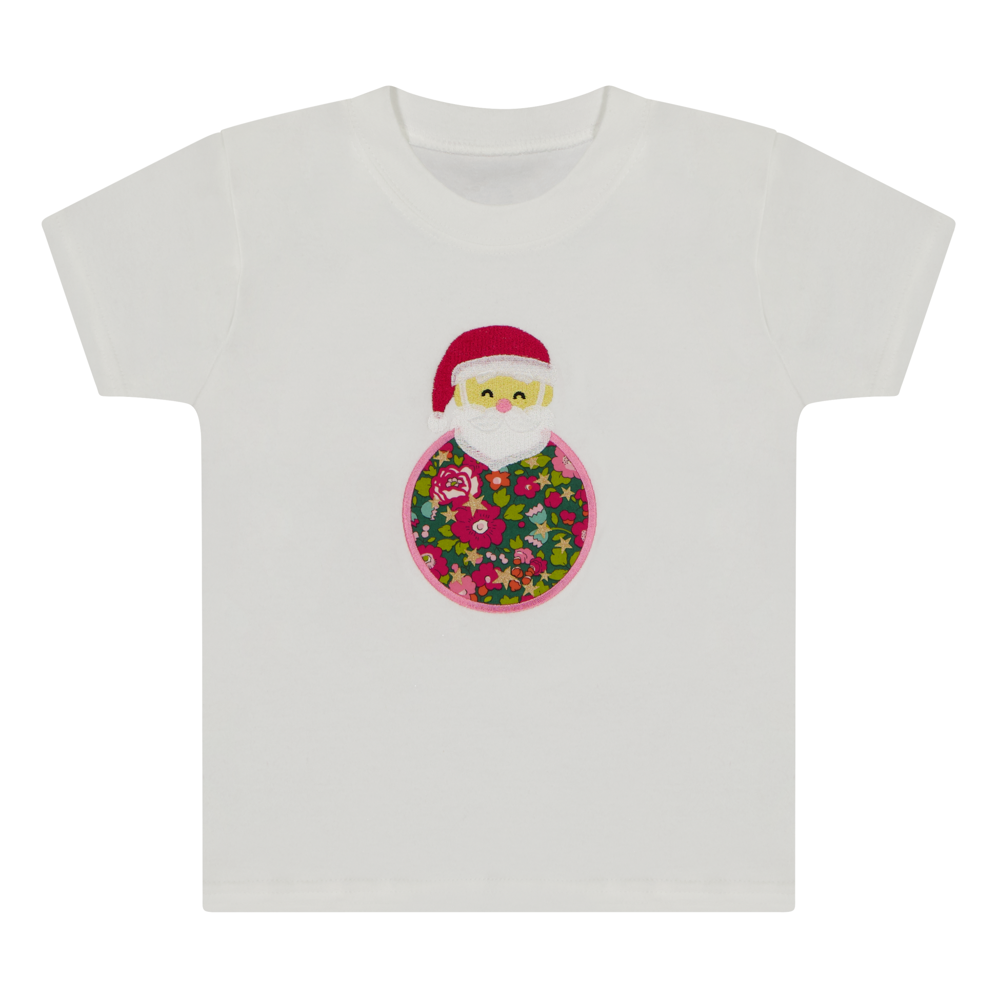 Super soft brushed cotton tee featuring a festive Santa bauble appliqué. The bauble is crafted from Liberty London Betsy Star fabric, outlined in Flamingo Glow pink thread, with Santa’s hat in Crimson Tide, nose in Flamingo Glow, and beard and hat trim in Arctic Dawn white. Simple, charming, and perfect for everyday wear.